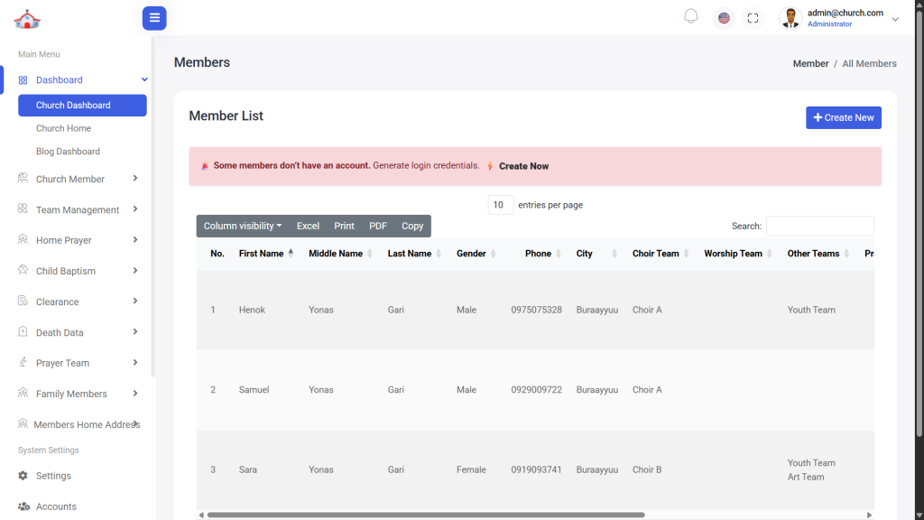 • Makes it easy to track who belongs to which team (choir, prayer, youth, etc.).