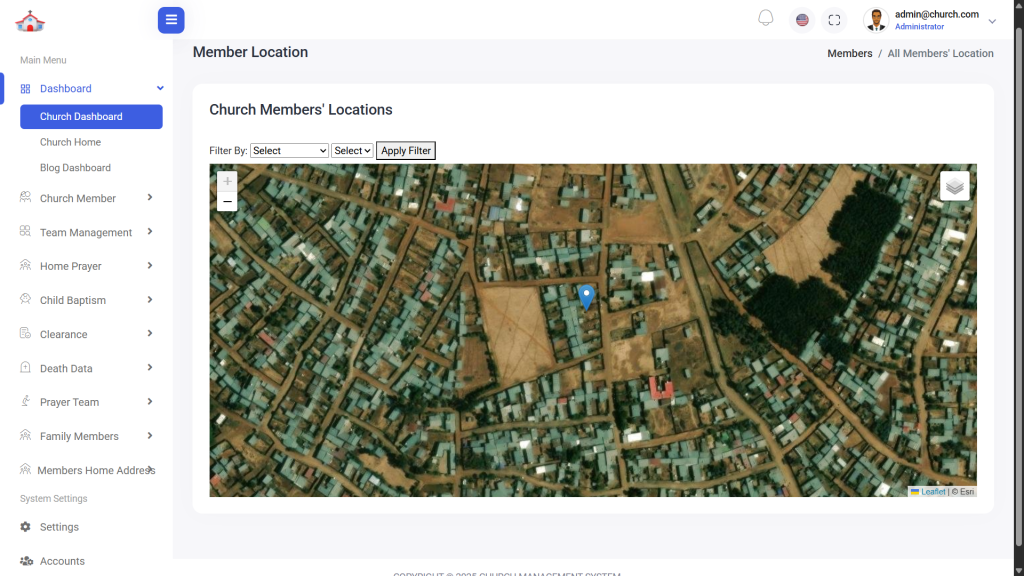 • Visualizes member home locations on a map so admins can plan visits and ministries.